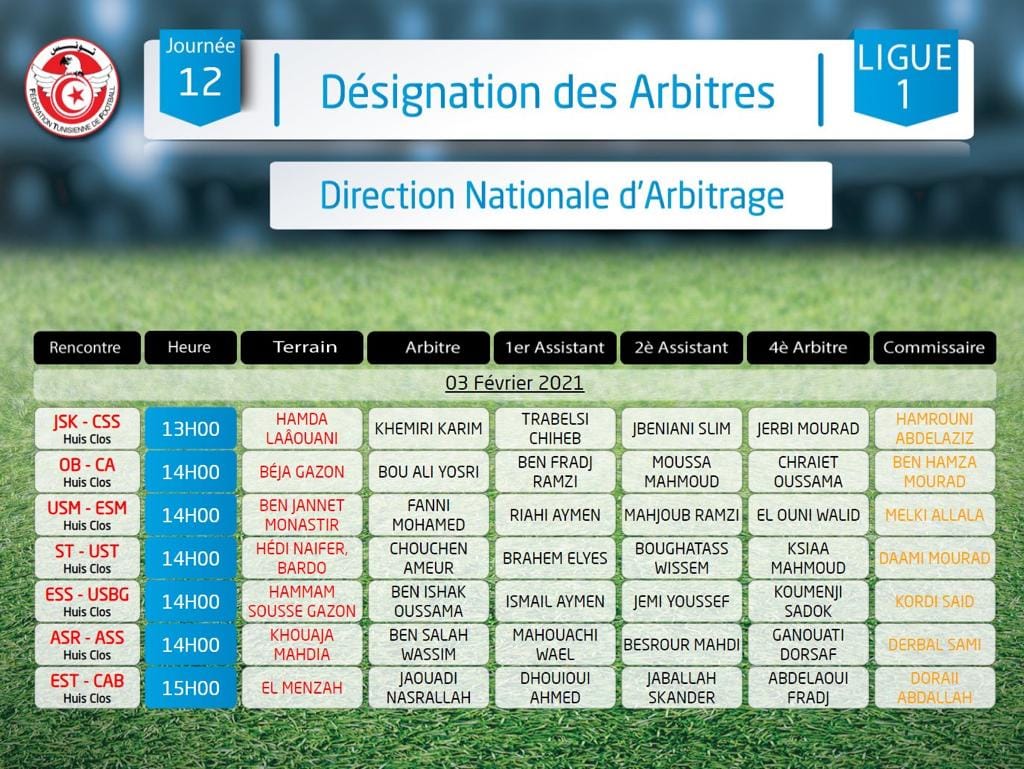 La Direction Nationale d'Arbitrage a communiqué la liste des arbitres qui dirigeront cette semaine les rencontres de la 11ème journée de la saison 2020-2021 en Ligue 1 :