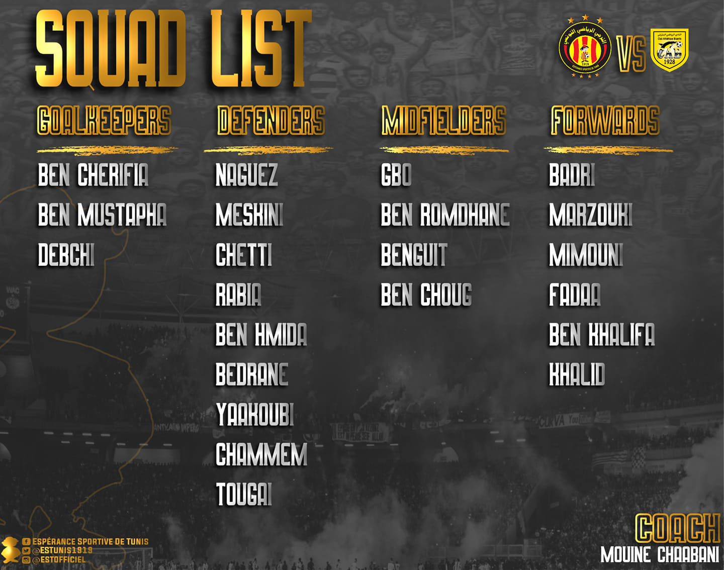 Le staff technique de l’Espérance Sportive de Tunis a communiqué la liste des joueurs qui seront présents ce mercredi pour affronter le Club Athlétique Bizertin en championnat de Ligue 1.