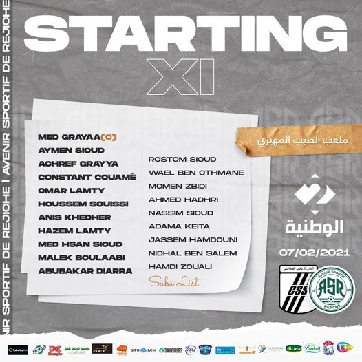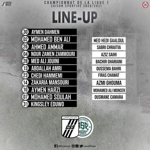 Voici les formations rentrantes du Club Sportif Sfaxien et de l'AS Rejiche qui seront opposés cet après midi pour le compte de la 13ème journée de la Ligue 1 2020-2021 :