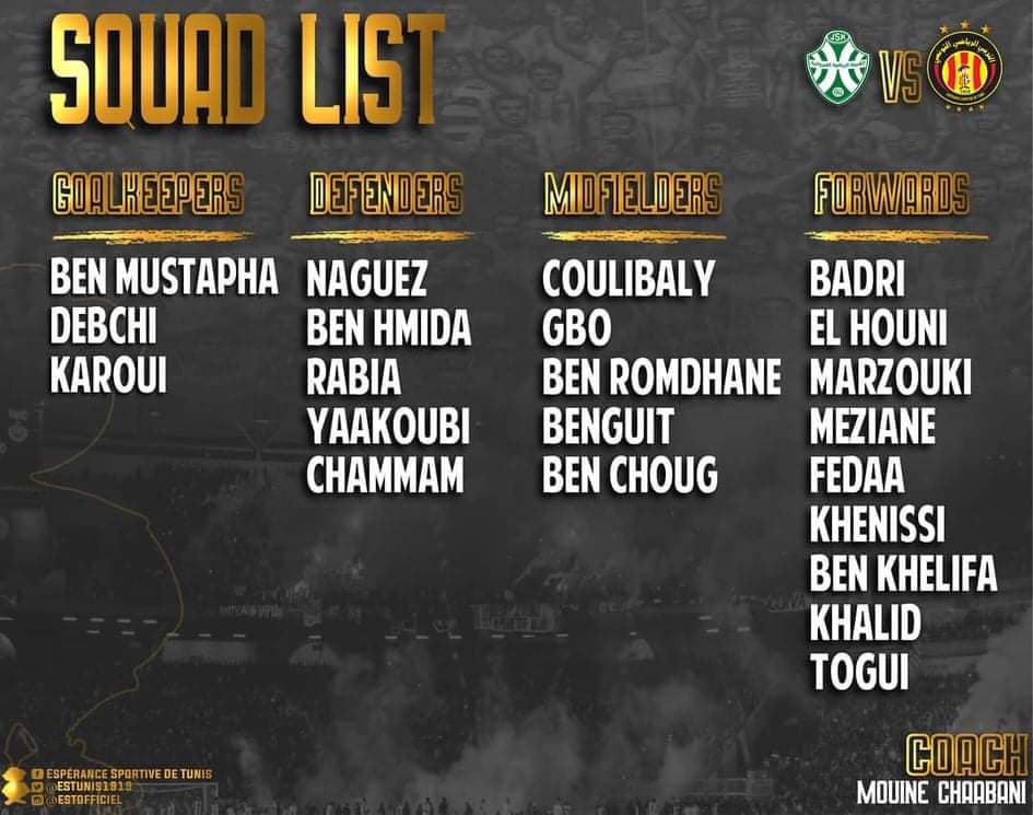 Le staff technique de l’Espérance Sportive de Tunis a communiqué la liste des joueurs qui seront présents ce mercredi pour affronter la Jeunesse Sportive Kairouanaise en championnat de Ligue 1.