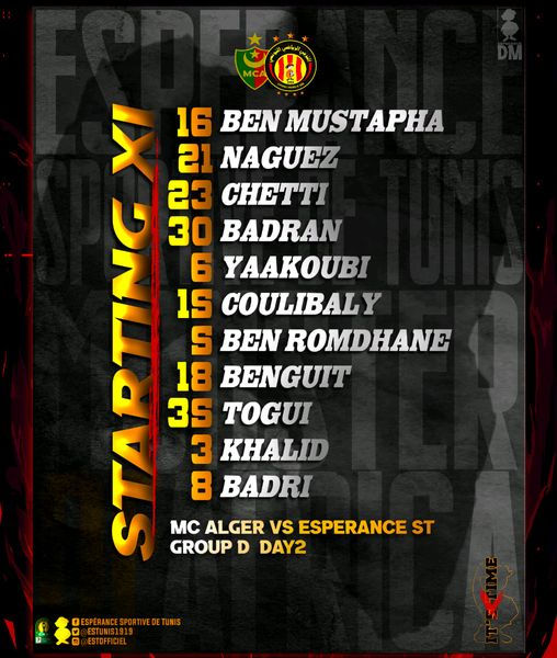 Suivez avec nous sur Kawarji ce mardi à partir de 20h00 l'évolution du score du match de la deuxième journée de la phase des poules en Ligue des Champions qui opposera le MC Alger à l'Espérance de Tunis :