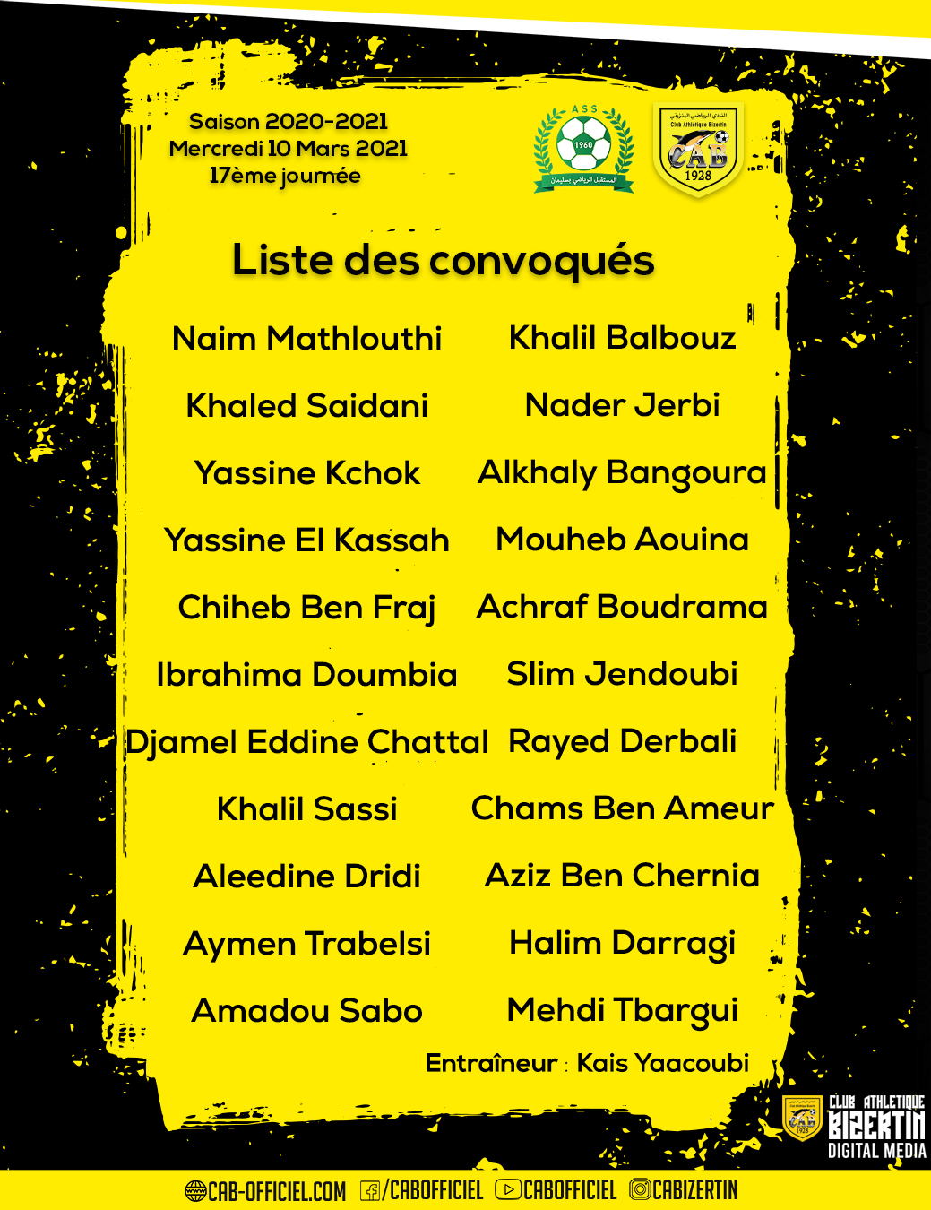 L1-J17 : Liste des joueurs du CA Bizertin convoqués face à l'AS Soliman