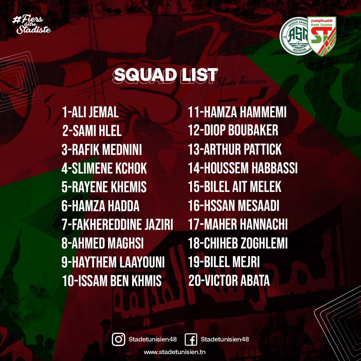 L1-J17 : Liste des joueurs du Stade Tunisien convoqués face à l'AS Rejiche