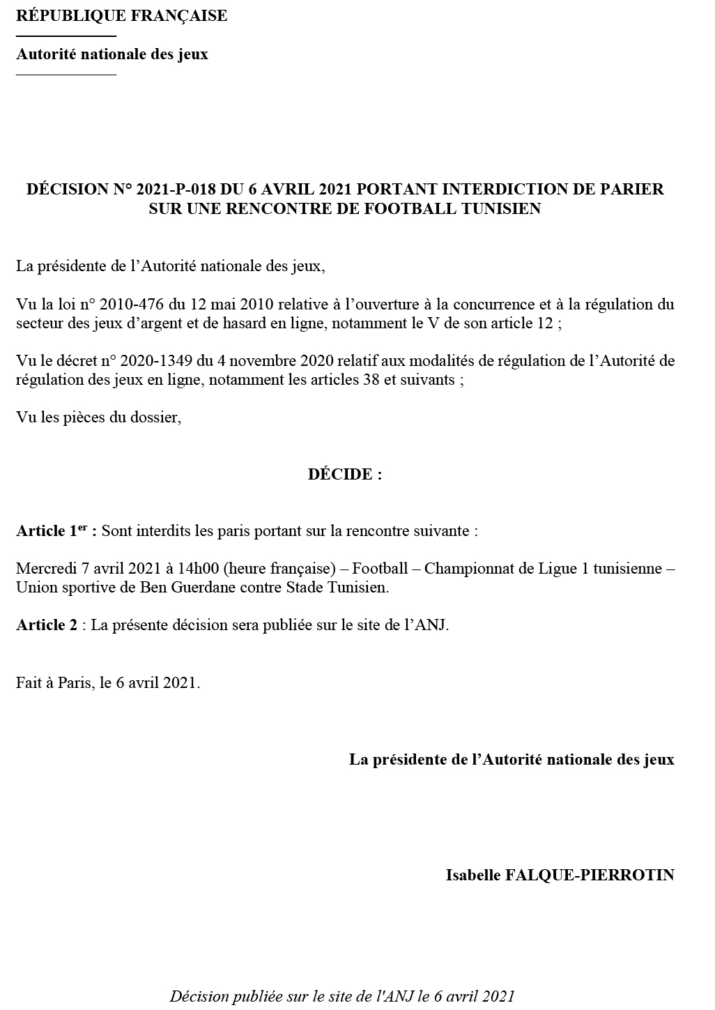 L’Autorité Nationale des Jeux en France a publié aujourd'hui une décision interdisant aux sociétés de paris de France d'intégrer un match du championnat tunisien.
