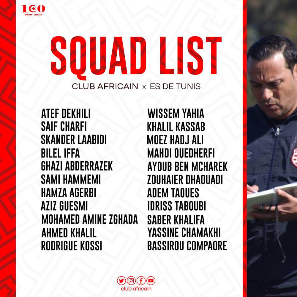 L1-J24 : Liste du Club Africain pour affronter l'Espérance de Tunis
