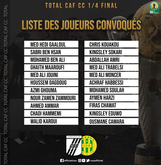Le staff technique du Club Sportif Sfaxien a communiqué la liste des joueurs qui ont été convoqués en vue de la rencontre des quarts de finale aller de la Coupe de la Confédération.