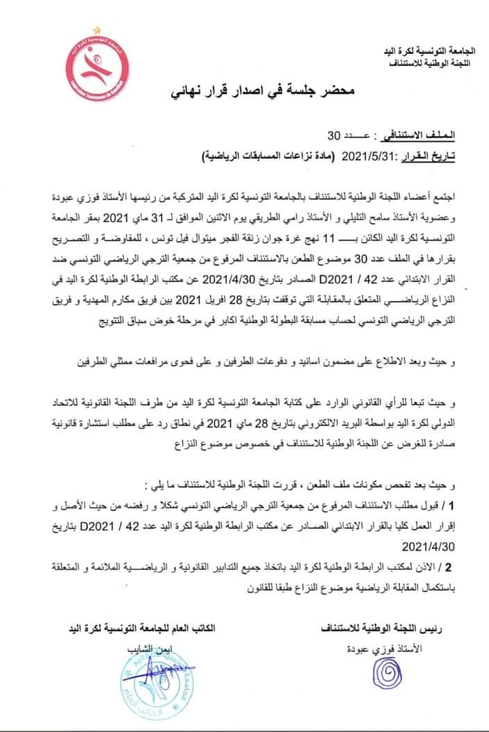 La commission d'appel de la Fédération Tunisienne de Handball a finalement décidé de reprendre le match à la minute à laquelle il a été suspendu.