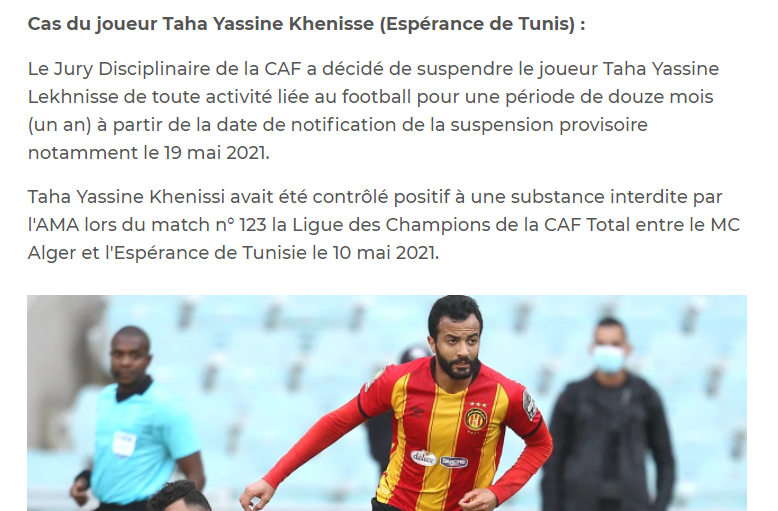 La Confédération Africaine de Football a décidé de suspendre l'attaquant de l'Espérance Sportive de Tunis Taha Yassine Khenissi pour une période de douze mois.