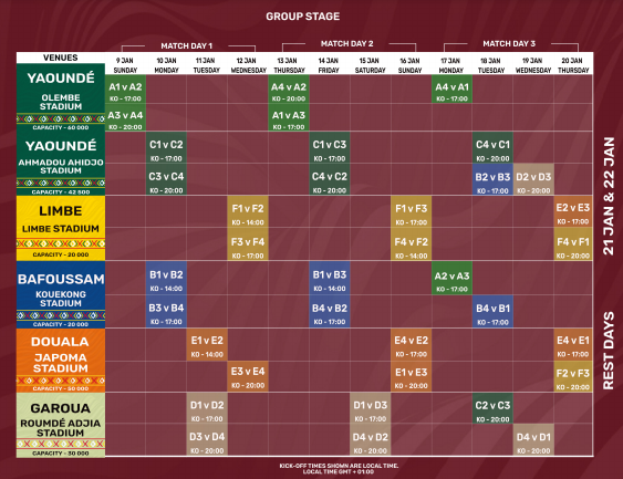 La Confédération Africaine de Football a communiqué aujourd'hui le programme détaillé des matches de la prochaine édition de la Coupe d'Afrique des Nations qui sera tenue au Cameroun.