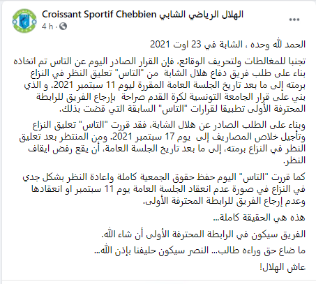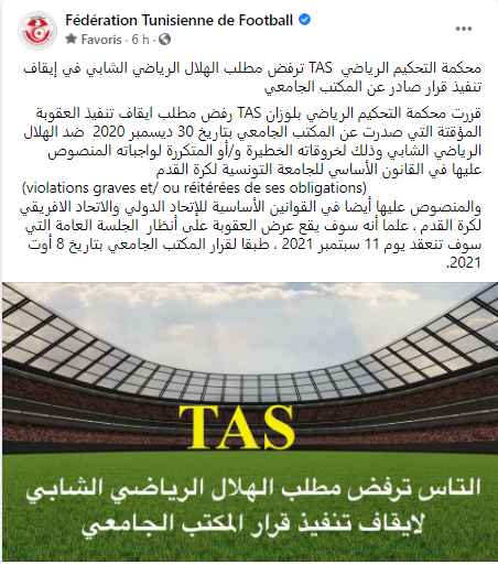 En début d'après midi, la FTF avait publié un communiqué dans lequel elle affirme que le TAS avait rejeté la demande de la formation de Chebba concernant la suspension de décision du bureau fédéral du 30 décembre 2020.