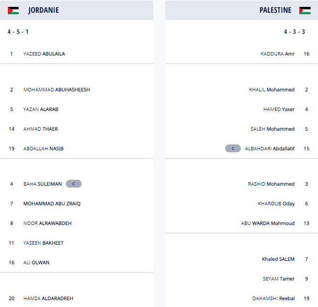 Score final : Palestine 1-5 Jordanie (PAL : Thamer Seyam 44 mn / JOR : Baha Abdel-Rahman (SP) 9 mn, Hamza Ali Khaled Al Daradreh 24 mn, Yasser Hamad (CSC) 82 mn, Yazan Abdallah Alnaimat 86 et 91 mn)