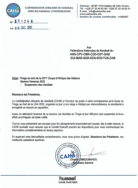 La Confédération Africaine de Handball a pris la décision d'annuler les résultats du tirage au sort du Championnat d'Afrique des Nations effectué hier.
