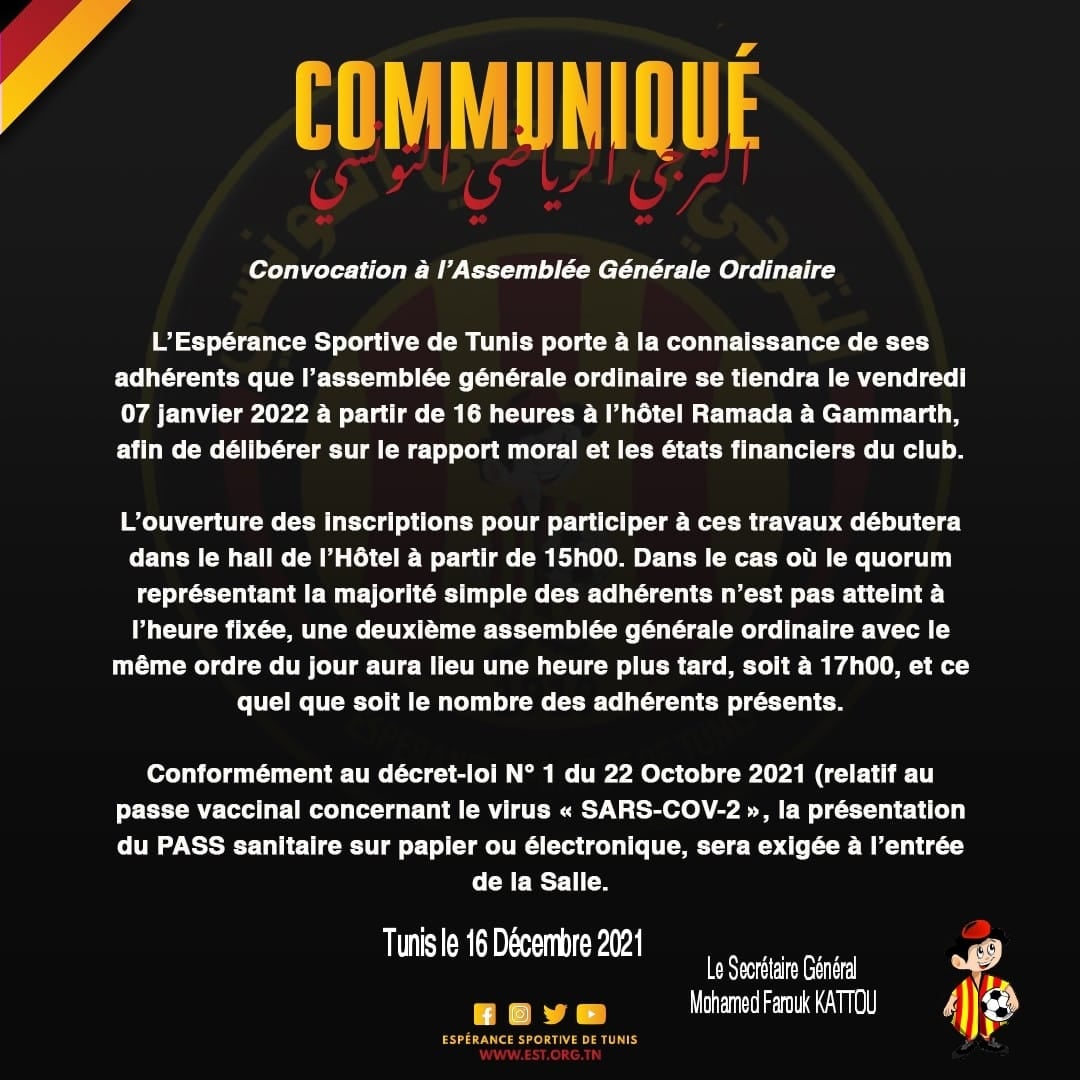 L'Espérance Sportive de Tunis tiendra au début du mois de janvier son assemblée générale ordinaire.