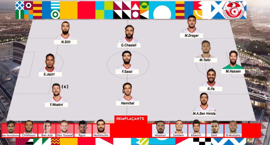 Voici la formation rentrante de la sélection tunisienne qui affrontera cet après midi la sélection algérienne en finale de la Coupe Arabe des Nations 2021 :