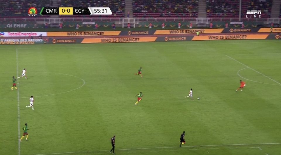 9 mn : La frappe de Salah passe à côté de la cage camerounaise