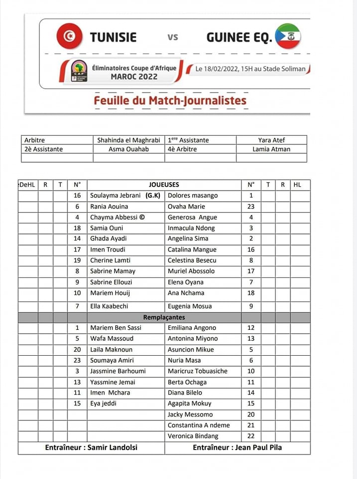 Suivez avec nous sur Kawarji à partir de 15h00 l'évolution du score du match aller de la sélection tunisienne féminine face à la Guinée Equatoriale au dernier tour des qualifications pour la Coupe d'Afrique des Nations :