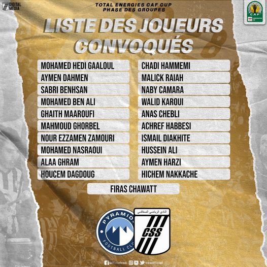 Le Club Sportif Sfaxien a communiqué la liste des joueurs convoqués pour la confrontation face à Pyramids FC pour le compte de la troisième journée de la phase des poules en Coupe de la Confédération.