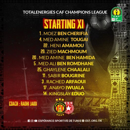 Suivez avec nous sur Kawarji à partir de 14h00 l'évolution du score du match de l'Espérance de Tunis face à l'Etoile du Sahel en phase des poules de la Ligue des Champions :