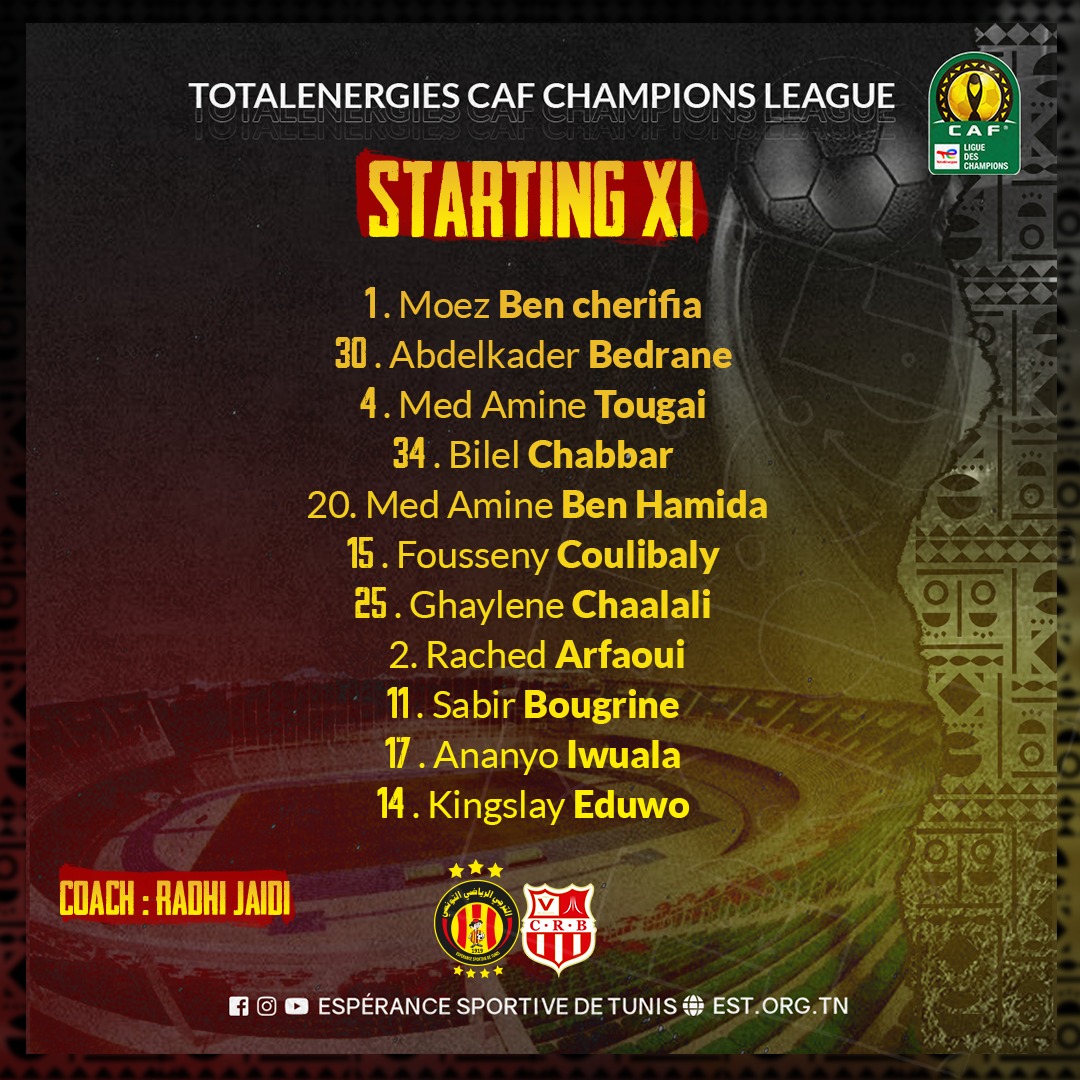 Suivez avec nous sur Kawarji à partir de 22h00 l'évolution du score du match de l'Espérance de Tunis face au CR Belouizdad en phase des poules de la Ligue des Champions :
