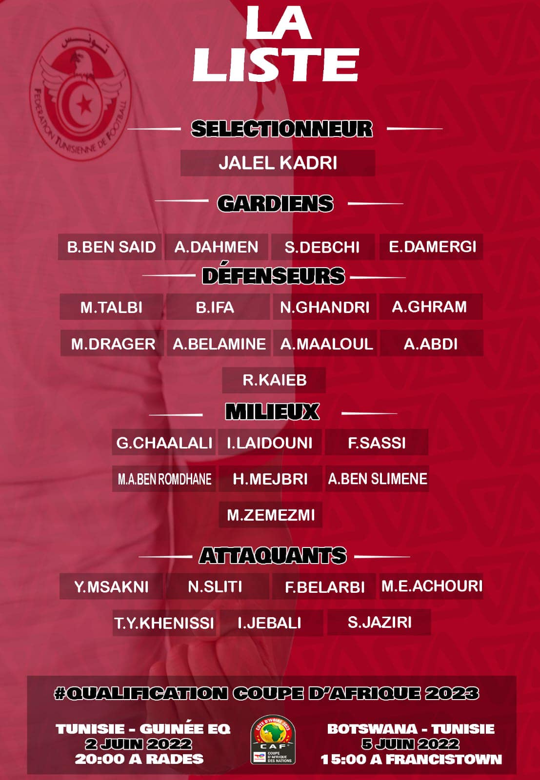 Le sélectionneur tunisien Jalel Kadri a communiqué ce jeudi sa liste de joueurs convoqués pour les prochains matches de la sélection tunisienne en éliminatoires de la Coupe d'Afrique des Nations 2023 et au tournoi amical au Japon.