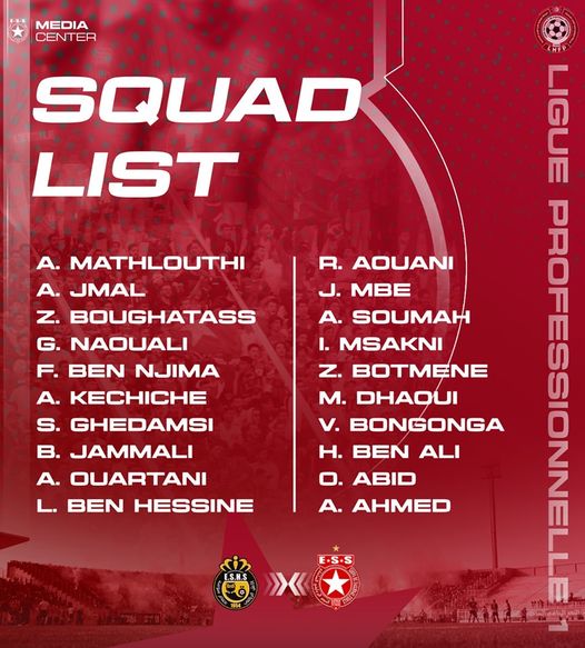 Voici la liste des joueurs de l'Etoile Sportive du Sahel convoqués pour affronter ce jeudi l'ES Hammam-Sousse à partir de 15h00 pour le compte de la 2ème journée du groupe A au championnat de Ligue 1 :