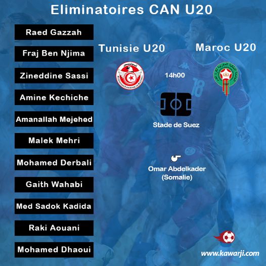 Suivez avec nous sur Kawarji à partir de 14h00 l'évolution du score du match des éliminatoires de la CAN U20 entre la Tunisie U20 et le Maroc U20 :