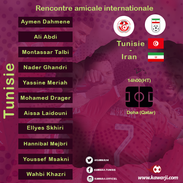 Suivez avec nous sur Kawarji à partir de 14h00 l'évolution du score du match amical entre la Tunisie et l'Iran :