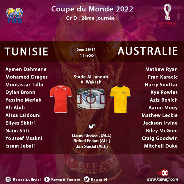 Suivez avec nous sur Kawarji à partir de 11h00 l'évolution du score du match de la Coupe du Monde 2022 qui opposera la Tunisie à l'Australie :