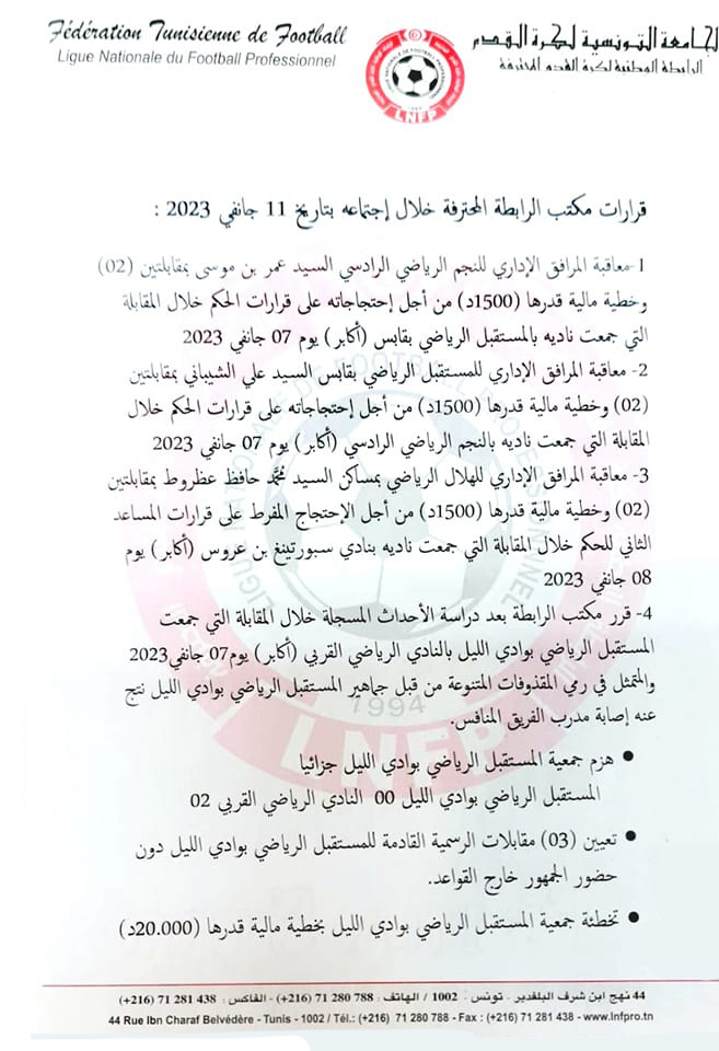 Par ailleurs, la formation de Oued Ellil a écopé d'une amende de 20 mille dinars et devra disputer ses trois prochains matches à domicile hors de son terrain et à huis clos.