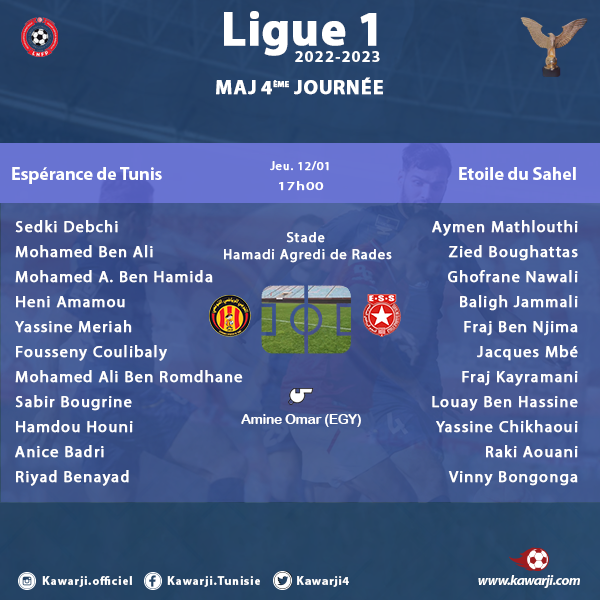 Suivez avec nous sur Kawarji à partir de 17h00 l'évolution du score du classico de Ligue 1 entre l'Espérance de Tunis et l'Etoile du Sahel :