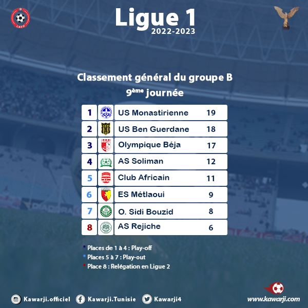 Ligue 1 : Classement général du groupe B après la 9ème journée