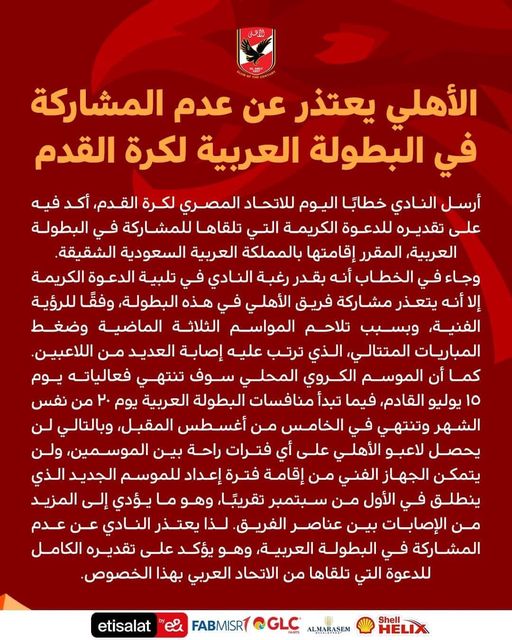Al Ahly a annoncé ce soir qu'il ne prendra pas part à la prochaine édition de la Coupe Arabe des Clubs.
