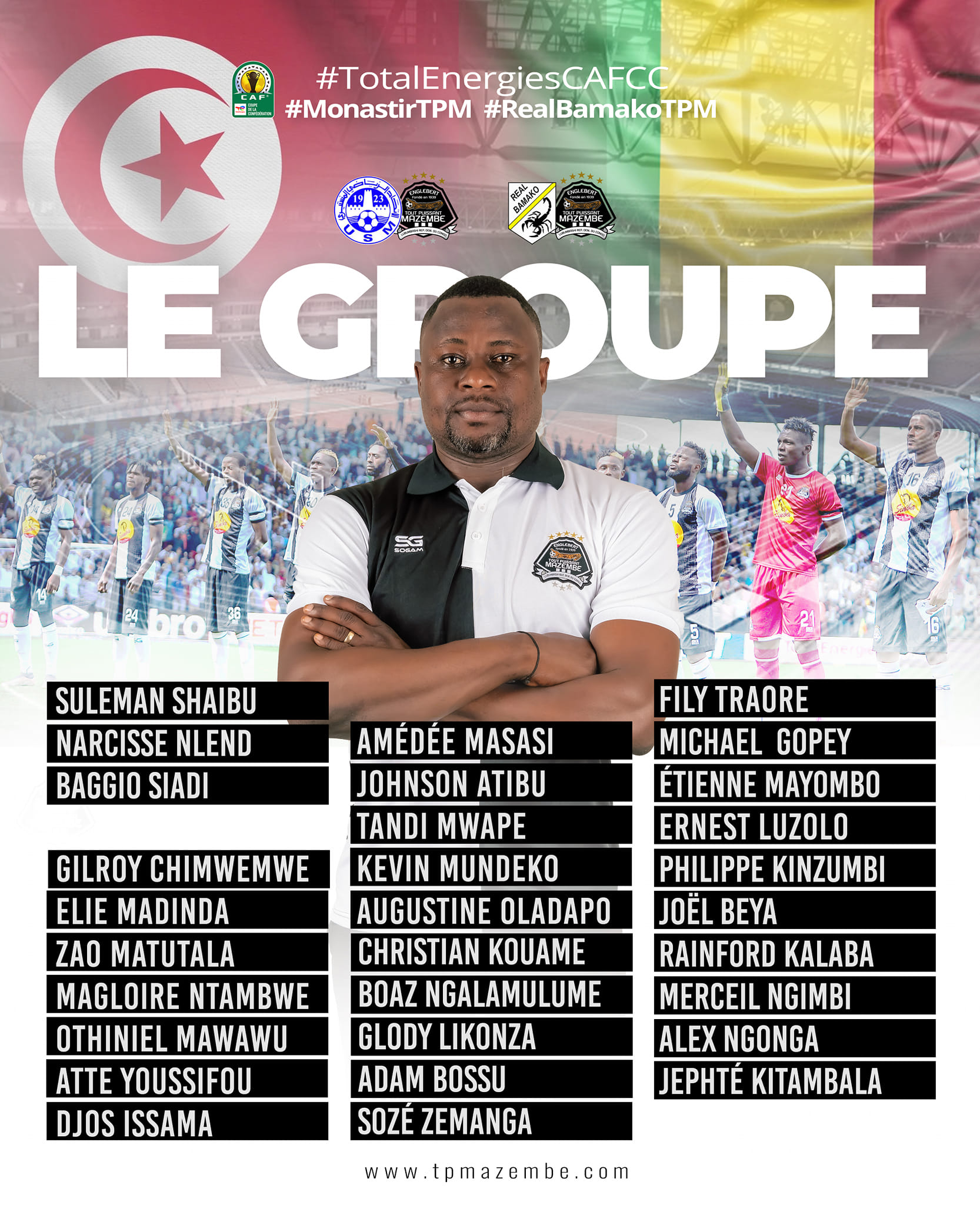 Voici la liste des joueurs du TP Mazembe appelés à disputer demain, mercredi, à partir de 14h00 la rencontre de la quatrième journée de la phase des poules en Coupe de la Confédération face à l'Union Sportive Monastirienne :