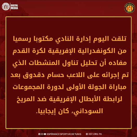 L'Espérance Sportive de Tunis a indiqué ce jeudi qu'un de ses joueurs a été testé positif à une substance interdite.