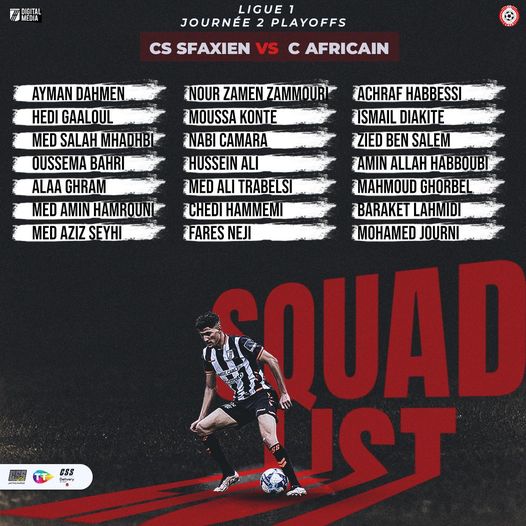 Le staff technique du Club Sportif Sfaxien a communiqué la liste des joueurs convoqués en vue de la rencontre de la 2ème journée de la phase de play-off en Ligue 1.