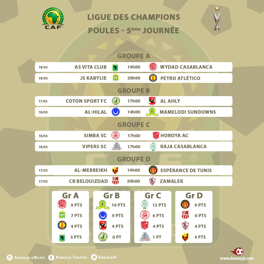 Trois rencontres pour le compte de la cinquième journée de la phase des poules en Ligue des Champions africaine auront lieu ce vendredi selon le programme suivant :
