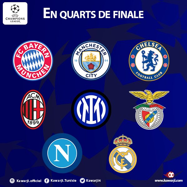 Ligue des Champions : Bayern Munich (ALL), Benfica (POR), Chelsea (ANG), Manchester City (ANG), Inter (ITA), AC Milan (ITA), Naples (ITA), Real Madrid (ESP)