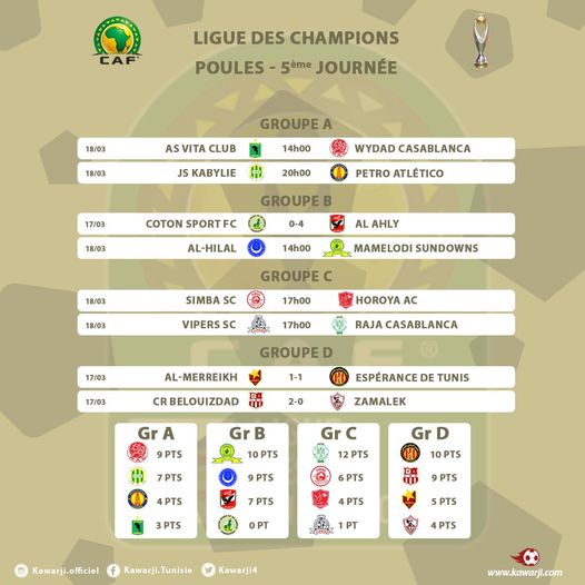 Classement : Wydad Casablanca 9 pts, JS Kabylie 7 pts, Petro Atlético 4 pts, AS Vita Club 3 pt