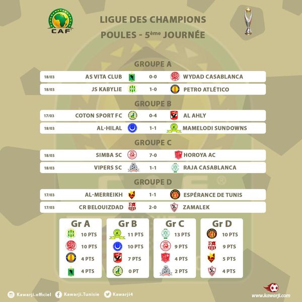 Classement : Raja Casablanca 13 pts (qualifié), Simba SC 9 pts, Horoya AC 4 pts, Vipers SC 1 pt