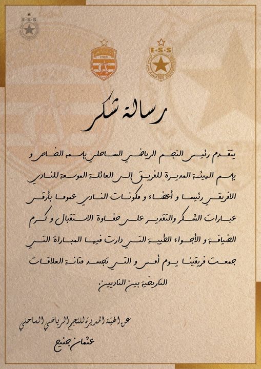 Les étoilés ont adressé une lettre de remerciement signé par leur président Othman Jenayeh en raison de l'accueil réservé à leur délégation hier au cours de la rencontre disputée au stade Hamadi Agrebi de Rades.