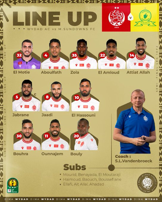 Suivez avec nous sur Kawarji à partir de 20h00 l'évolution du score du match de la demi-finale aller de la Ligue des Champions entre le Wydad Casablanca et Mamelodi Sundowns :