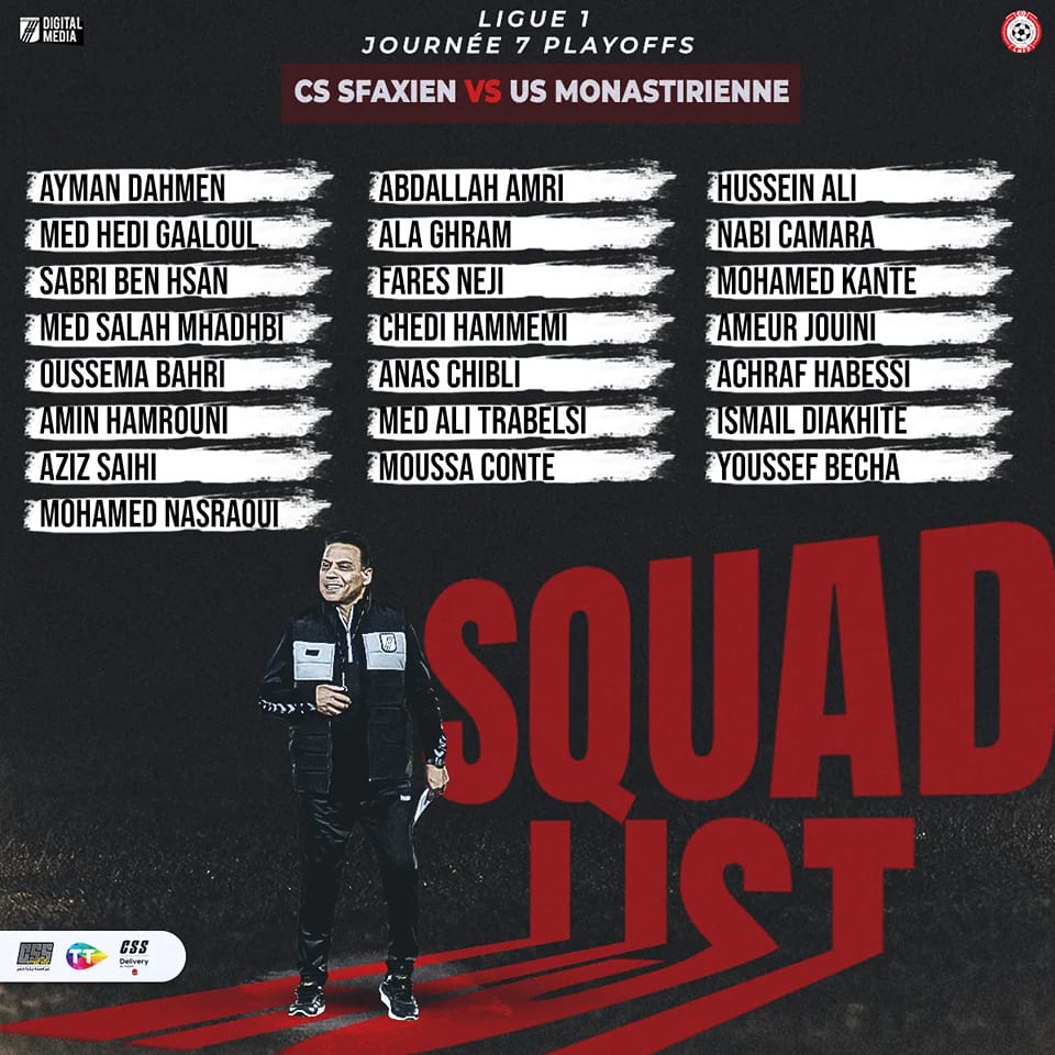 Le staff technique du Club Sportif Sfaxien a communiqué la liste des joueurs convoqués en vue de la rencontre de la 7ème journée de la phase de play-off en Ligue 1.