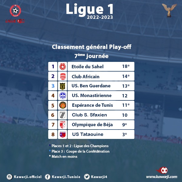 Voici le classement général de la phase de play-off en Ligue 1 avant le match de la septième journée prévu cet après midi entre l'Olympique de Béja et l'Etoile du Sahel :