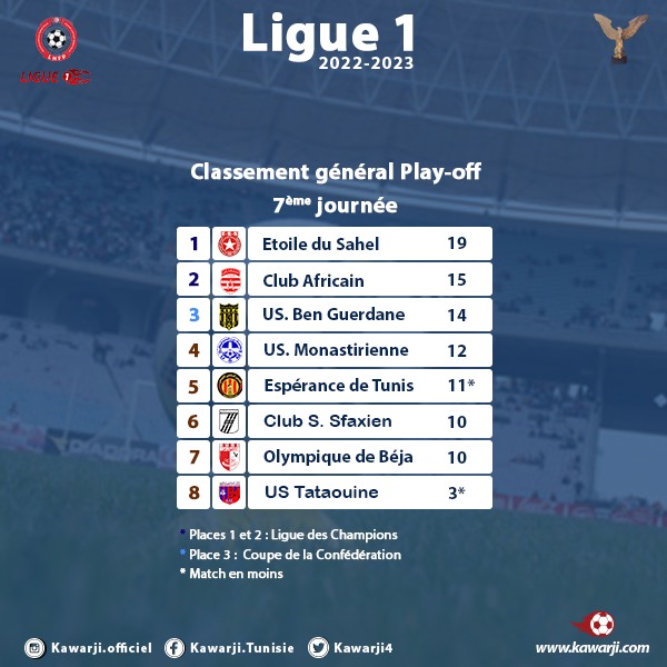 Voici le classement général de la phase de play-off en Ligue 1 après le match de la septième journée disputé cet après midi entre l'US Ben Guerdane et le Club Africain :