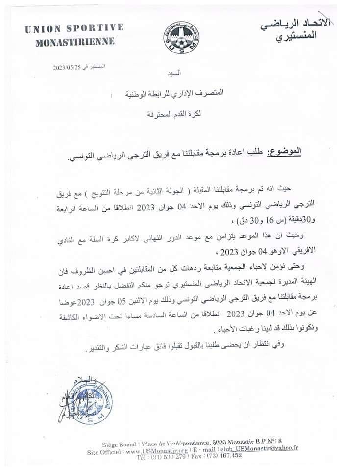 L'Union Sportive Monastirienne a demandé à la Ligue Nationale de Football Professionnel le changement de la date de son match face à l'Espérance de Tunis.