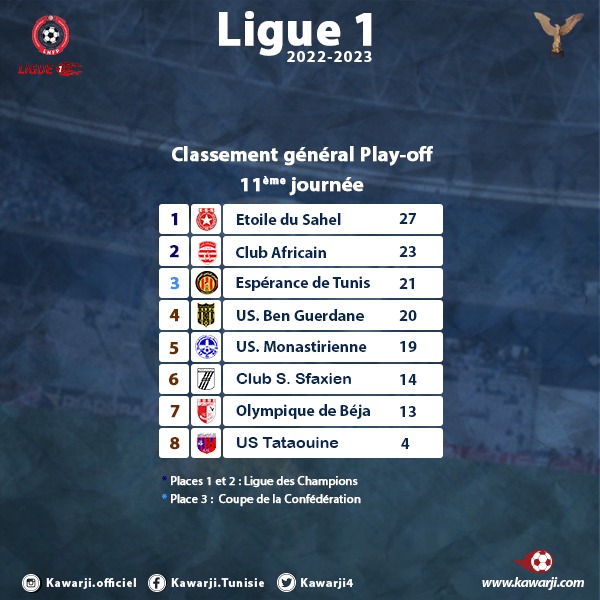 Voici le classement général de la phase de play-off en Ligue 1 à l'issue des matches de la 11ème journée :