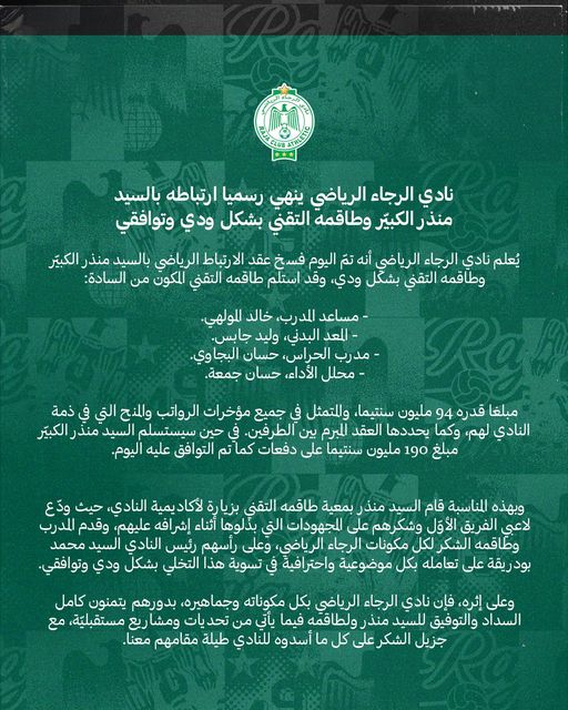 La formation marocaine du Raja Casablanca a annoncé aujourd'hui la résiliation du contrat de l'entraineur tunisien Mondher Kebaier.