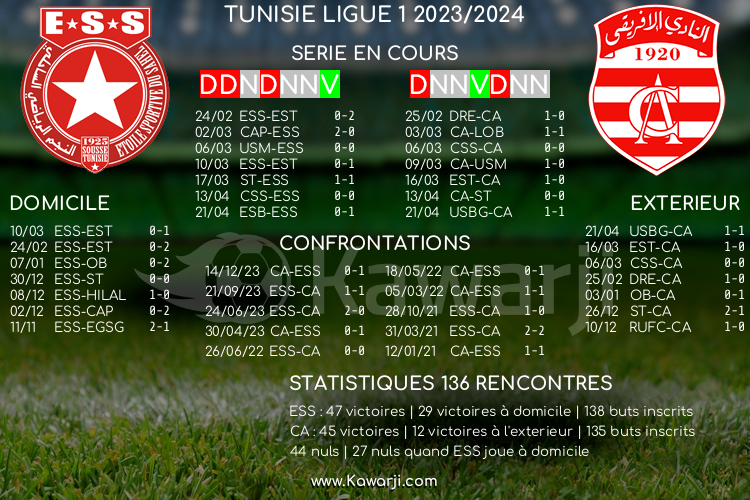 Avant les rencontres prévues ce samedi pour le compte de la 12ème journée de la phase de play-off en Ligue 1 tunisienne 2022-2023, voici l'historique et les statistiques relatifs à ces confrontations :