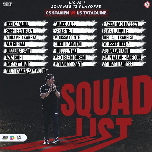 Le staff technique du Club Sportif Sfaxien a communiqué la liste des joueurs convoqués en vue de la rencontre de la 13ème journée de la phase de play-off en Ligue 1.