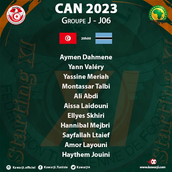 Suivez avec nous sur Kawarji à partir de 20h00 l'évolution du score de la rencontre des éliminatoires de la Coupe d'Afrique des Nations 2023 entre la Tunisie et le Botswana :